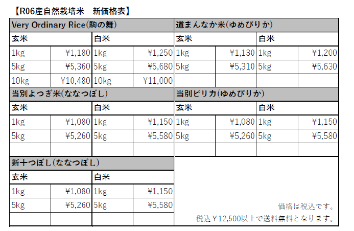 つきましては令和6年産より、下記の新価格にて販売させていただきます。
