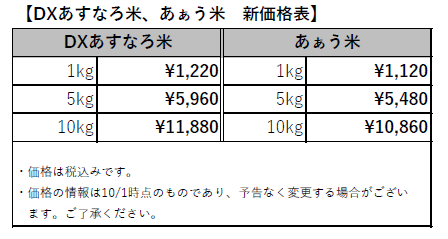 平素は格別のご高配を賜り誠にありがとうございます。さて、大変心苦しいお知らせではございますが、弊社では原料米の価格高騰の影響を受け、DXあすなろ米ならびに、あぁう米の価格を新米の販売開始とともに下記のとおり改訂させていただくこととなりましたのでご案内いたします。