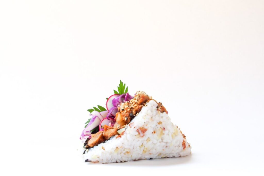 ヤンニョムチキン をサンドするご飯には梅干しを混ぜ込み、全体のまとまりを高めると共に、夏の疲労回復に期待。