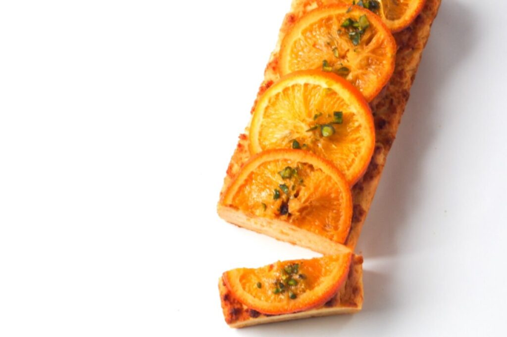 しっとり、ソフトな仕上がりの生地は、米粉特有のモチモチ感や重たさはありません。 植物性由来の素材たちの絶妙な調和で「卵」を使っているかのようなコクのある味わい。オレン ジとレモンの “ピール” が爽やかに香ります。