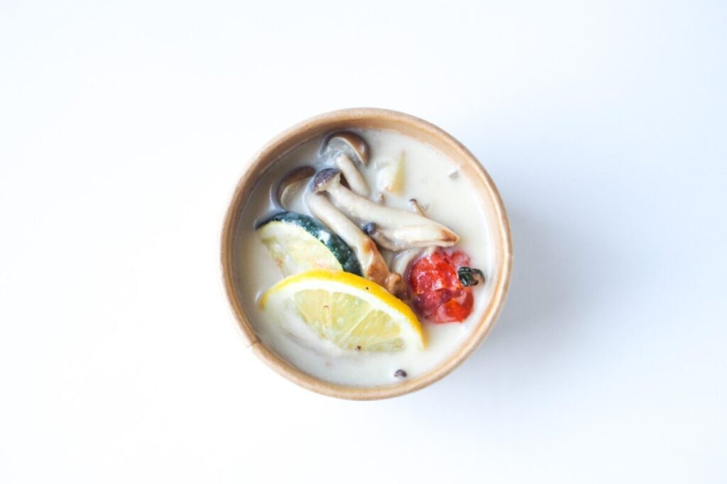 こちらは、ココナッツミルクベースのスープ。ローストしたミニトマトやズッキーニなど彩り豊か な夏野菜を具材に。トッピングには輪切りにしたレモン。スプーンで潰して果汁をスープに馴染ま せると、一気に爽やかな酸味の効いた味わいになるので、ぜひ試してみて。