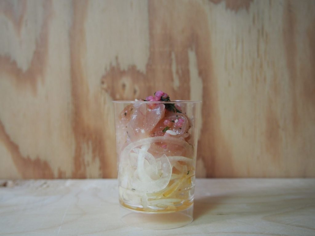 マリネも春らしい一品が登場。質の良い桜鯛を、大葉、塩麹、レモン汁などでマリネし、梅酢漬けのキヌアを飾りました。自然なピンク色で、見た目にも春を感じさせてくれます。500円(税別)
