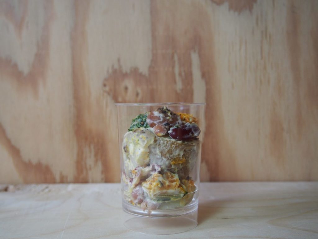 サラダとみそ玉も、これまでのラインナップにはないタイプのものを用意しました。サラダは、「ホクホク野菜の豆乳マヨサラダ」。ジャガイモ、カボチャ、サツマイモ、ブロッコリー、豆類に歯ごたえのあるレンコンをプラス。これらを豆乳で作った自家製マヨネーズで和え、野菜の持つ自然な甘みを引き出しました。400円(税別)。