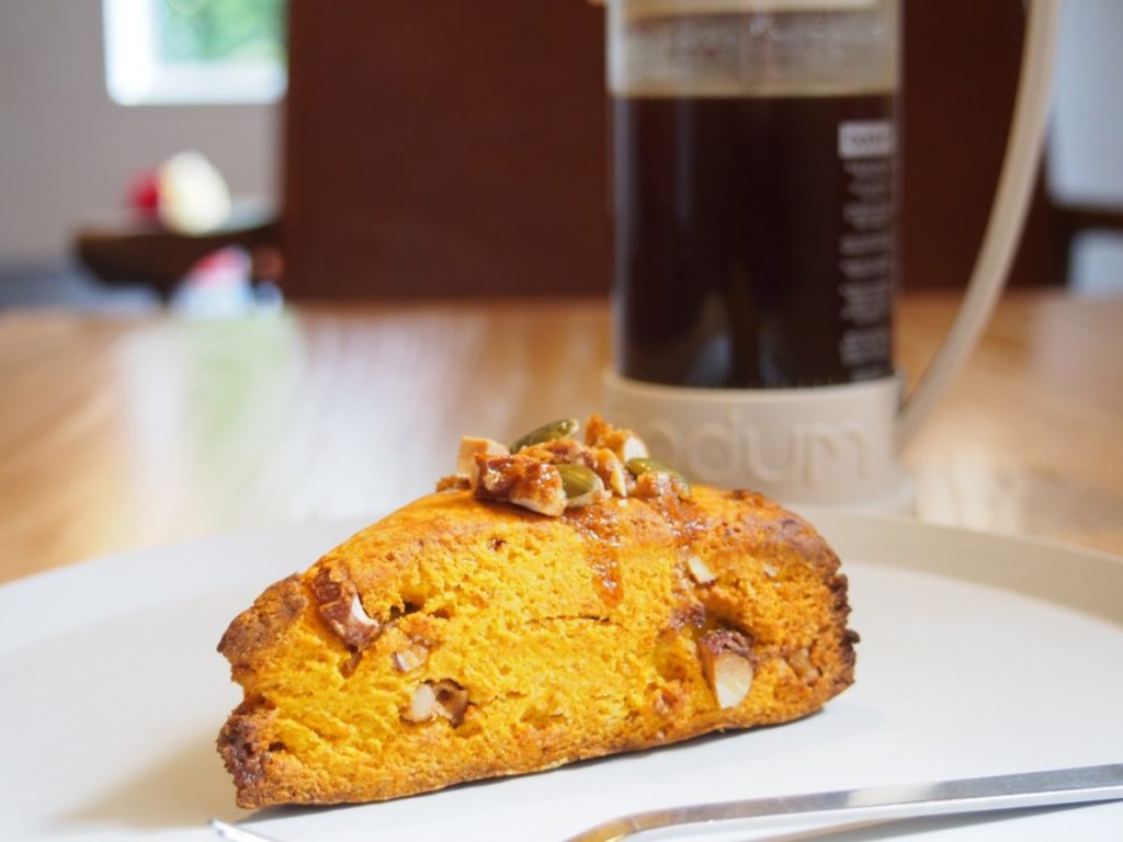 もう一つのカボチャメニューが、「かぼちゃスコーン」。マッシュしたカボチャと甘酒を生地にたっぷり使いました。上には、塩メープルでコーティングしたナッツがトッピングされていて、甘みと香ばしさを一緒に味わえます。温かい紅茶やコーヒーとの相性もピッタリです。350円。