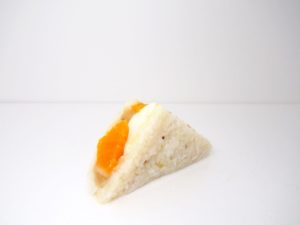 1月のこめサン®は、その名も「新年モチみかんサンド」! イチゴ、モモに続く、フルーツこめサン®の第三弾です。今回は、新年にふさわしい縁起の良い食材「みかん」を用います。手亡豆を使ったやさしい甘さの白あんに雑穀を加え、モチっとしたジーマミー豆腐、みかんをもち米でサンド。もち米の白とみかんの組み合わせが、まるで鏡もちのようです。手亡豆は、札幌のファームまつもとの自然栽培豆を使用しています。350円。