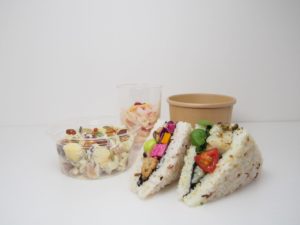 また、「腸ハッピー」にちなんで、「腸ハッピーセット」も登場。ホタテのケーパーマリネサンドともう一つお好きなこめサン®、レンコンの塩糀ゆずマリネ、サツマイモとリンゴのサラダ、ゆり根のポタージュを組み合わせたお得なセットです。1月らしく雪を彷彿とさせる清らかな「白色」を基調にしたセットです。1690円。