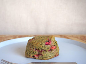 甘いものだけでなく、ほろ苦い山菜も春の味覚の代表です。ヨモギもそんな春の山菜の一つ。4月のスコーンは、そのヨモギをブレンドした野草茶を用いた「野草と苺のスコーン」です。ほろ苦さの中に、セミドライした苺の甘さや香りがアクセントとなって、春を感じさせてくれます。350円。