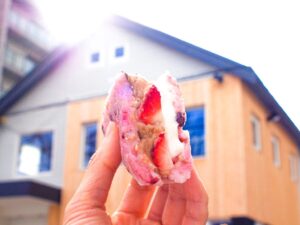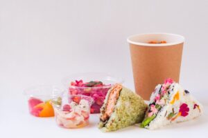マンスリーのこめサン®は、「ふきのとうクリームチーズサンド」。パンチのあるマンスリーが続いたのですが、今回は春のさわやかさと軽やかさを味覚で感じさせてくれるこめサン®に仕上がっています。早春の山菜・ふきのとうといえば、ふきのとう味噌をイメージするかもしれませんが、今回は味噌を使わず塩で味付けしたものを使用。豆乳から作ったクリームチーズとの相性もバッチリ。ほろ苦さがちょうど良いアクセントになっています。また、たっぷり入ったレタスのみずみずしさとシャキシャキ食感もポイント。ご飯には、エディブルフラワーを混ぜ、春らしく華やかにまとめています。350円。