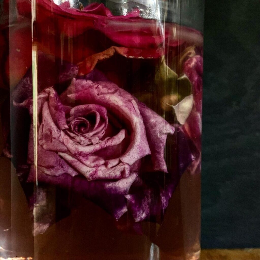 イベント期間中は空間展示を楽しみながら2Fイートインをご利用いただけます。天井に吊るされた鮮やかなバラの下で、ももサンドとコーヒーのペアリングをお楽しみください。