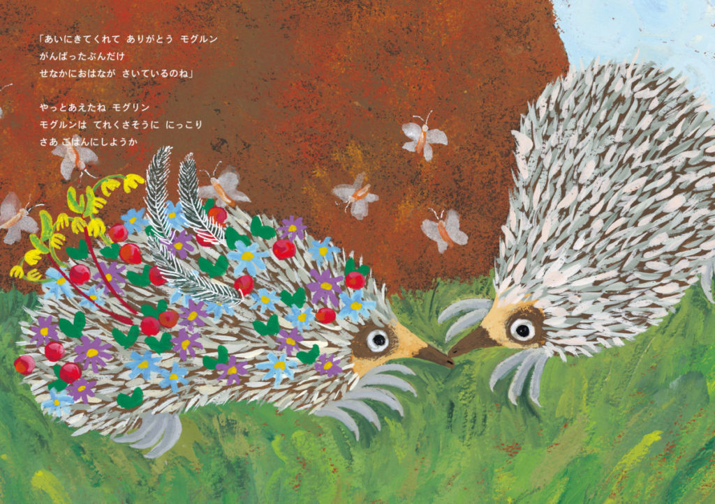 「でも、なぜハリモグラ?」の問いに、ひだのさんは「動物園のオランウータンがね、よく背中に葉っぱをつけていたの。それを見ていて、背中に針がついている動物だったら、もっといっぱいいろいろなものがついて大変だろうなと思って、そこから物語が広がっていったの」と話します。ハリモグラのほかにもハリネズミ、ヤマアラシと、背中に針を持つ動物はいますが、ハリモグラは敵に見つかると穴を掘ってもぐります。その際にも背中にいろいろなものがつくだろうと思ったそう。「調べていくうちに、視力があまりよくないと分かったので、匂いや音で近づいてきたものを察知するというのも物語としておもしろいなと思って」と振り返ります。